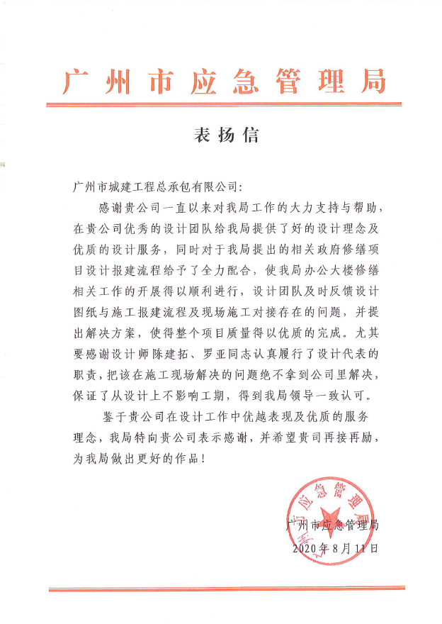 8月,廣州市應(yīng)急管理局向我公司發(fā)來表揚信,對我公司為廣州市應(yīng)急管理局建設(shè)工作的支持表示衷心感謝和贊揚,其中對設(shè)計團隊陳建拓、羅亞同志突出的工作表現(xiàn)給予高度評價。