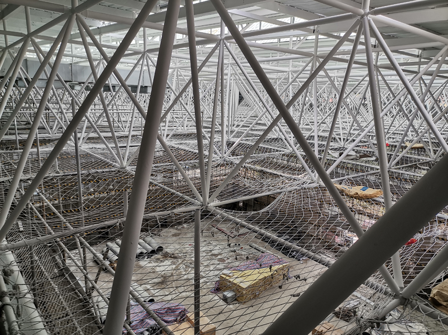現(xiàn)場施工人員從工程特點(diǎn)、施工程序、施工工藝、施工技術(shù)等方面作了詳細(xì)講解,雙方就關(guān)鍵技術(shù)點(diǎn)進(jìn)行了全方位技術(shù)交流。該網(wǎng)架結(jié)構(gòu)采用網(wǎng)架桿件、螺栓球等網(wǎng)架材料,整體網(wǎng)架尺寸為39x42米,重量約69.5噸,吊裝提升高度約14.9米。根據(jù)該網(wǎng)架的特點(diǎn),選用高空散裝方法安裝,將網(wǎng)架分為幾個單元,首先在地面進(jìn)行每塊區(qū)域單元網(wǎng)架的拼裝,然后進(jìn)行單元網(wǎng)架整體吊裝,最后在空中拼裝成一個大整體。個別單元網(wǎng)架由于局部角點(diǎn)問題,如安裝死角、吊臂位置受限等特殊因素導(dǎo)致吊車無法發(fā)揮正常使用功能,將網(wǎng)架材料運(yùn)送至事先安裝好的一個6X6米、高12米的鋼架平臺上,在平臺上拼裝成一球四桿的小單元網(wǎng)架后,然后人工搬運(yùn)小單元網(wǎng)架到安裝位置進(jìn)行整體拼裝。為防范安全風(fēng)險(xiǎn),在散裝的拼接過程中,散裝區(qū)域下方確保有一個鋪滿安全網(wǎng)的腳手架平臺,做好高空作業(yè)人員防護(hù)措施,避免拼裝過程的安全隱患。