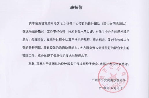 近日,廣州市公安局南沙區(qū)分局送來(lái)表?yè)P(yáng)信,對(duì)我公司廣州市南沙公安分局110指揮中心裝修設(shè)計(jì)工程的設(shè)計(jì)團(tuán)隊(duì)給予表?yè)P(yáng)。 該項(xiàng)目設(shè)計(jì)時(shí)間緊、要求高,我公司在承接項(xiàng)目后,派駐專(zhuān)業(yè)設(shè)計(jì)團(tuán)隊(duì)全力開(kāi)展項(xiàng)目設(shè)計(jì)任務(wù),積極...
